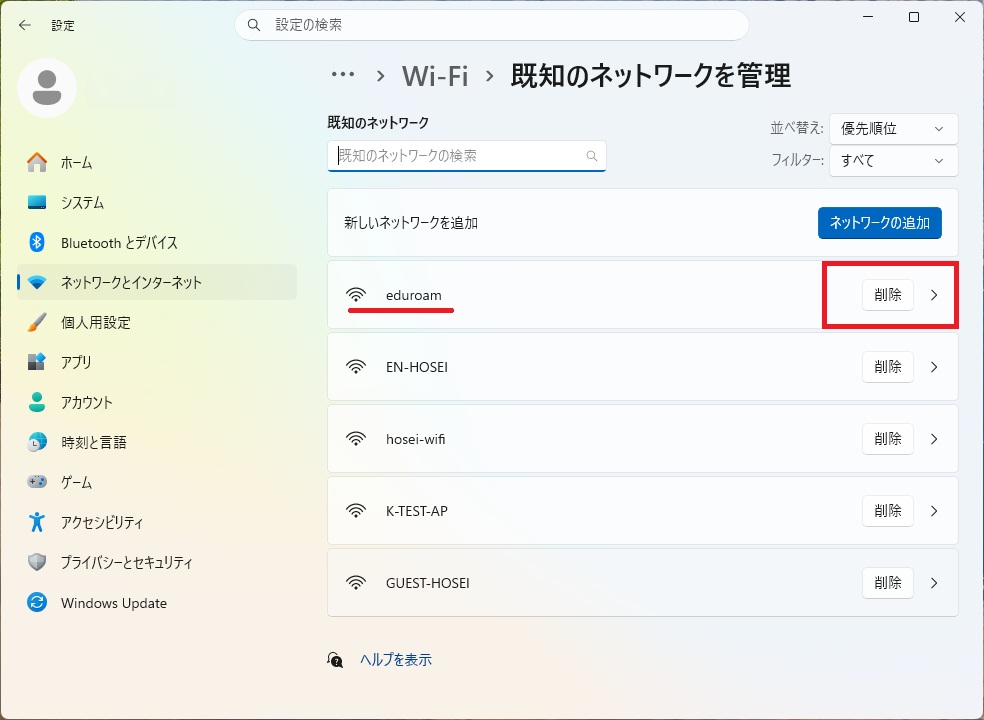 既知のネットワークから、設定済のeduroamのSSIDプロファイルを削除してください。