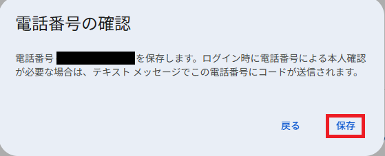 ⑧確認画面が表示されるため入力した電話番号に誤りがないか確認して「保存」をクリックします。